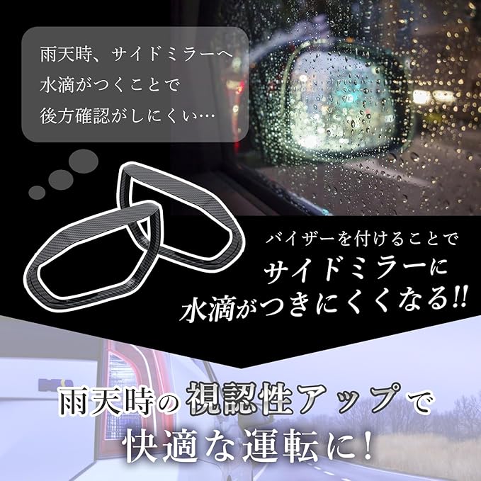 【視界確保】サイドミラーへバイザーアクセサリーを取り付けることで雨や雪がミラーに直接あたることを防ぎ視界を保つ!悪天候時の視認性が向上します。