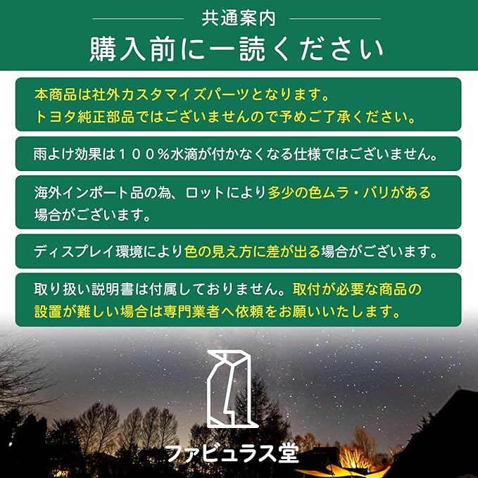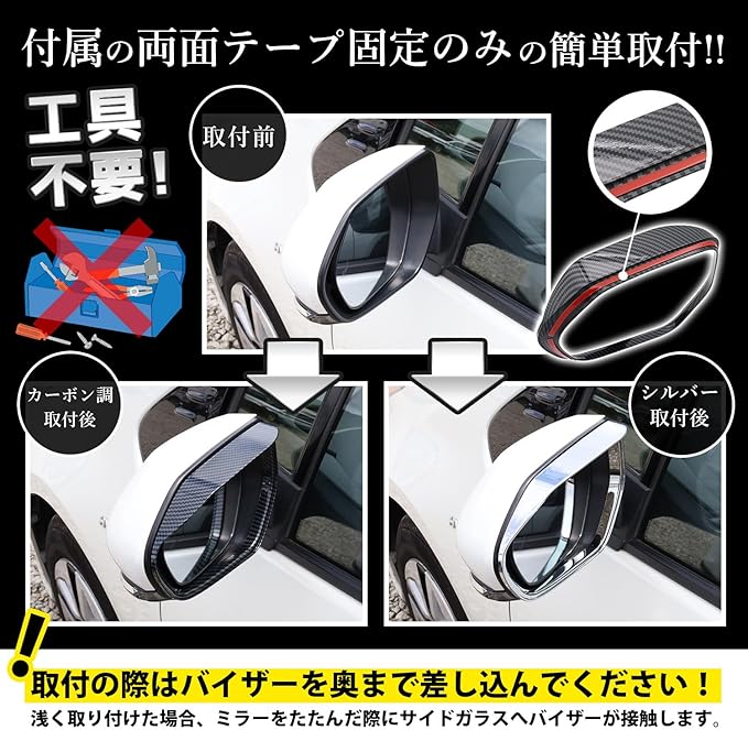 【簡単取付】作業方法は貼付け済みの両面テープ固定のみ!工具不要ですのでカスタム初心者でも簡単に取り付け可能です。※取付の際はバイザーを奥までしっかりと差し込んでください。浅く取り付けるとミラーを畳んだ際にサイドガラスにバイザーが接触します。