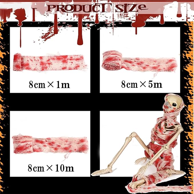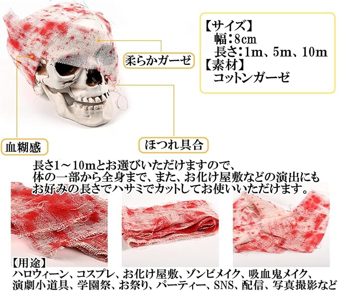 少しほつれた柔らかいガーゼ包帯に赤が染色されており、血糊の付いたリアルな血まみれの怪我の演出やゾンビメイクに最適です。