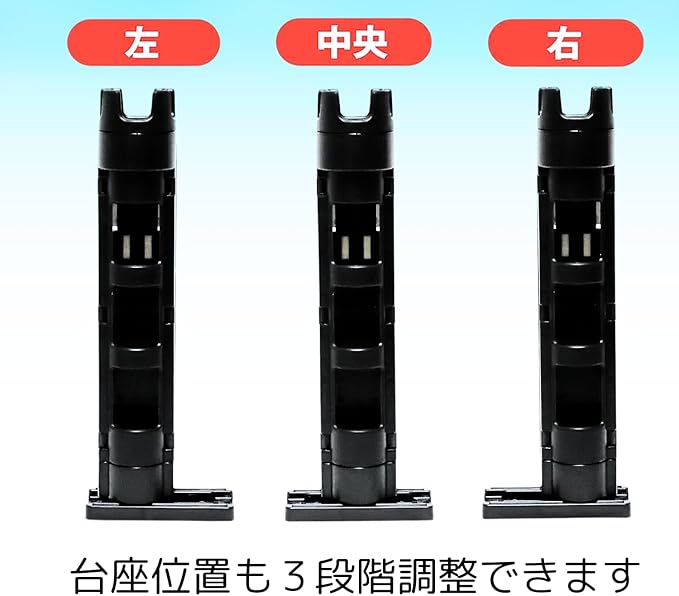 高さと台座位置は3段階調節可能:ロッドホルダーの高さは3段階(28cm・34cm・40cm)に調整できます。釣り竿のサイズに合わせて自由に調節できます。また横転を防ぐための台座の位置も3段階(左・中央・右)に調整できます。