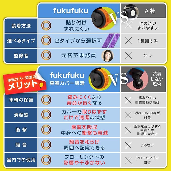 【外れにくい貼り付けタイプ】 従来の商品だと、車輪にはめ込むだけなので、使用中に外れやすく紛失することもありますが、この商品は裏面がテープになっており、直接車輪に張り付け使用するので使用中も外れにくく長く使用できます。 ※本商品のサイズ 縦:20㎝ 幅:1.2㎝ 厚さ:2.5mmになります。ご購入の際はキャスターの全周と幅、貼り付け後に干渉する部分がないかのご確認をお願いいたします。また、貼り付け時はキャスターの汚れ等をしっかりと拭き取り、隙間が無いようにしっかりと貼り付けてください