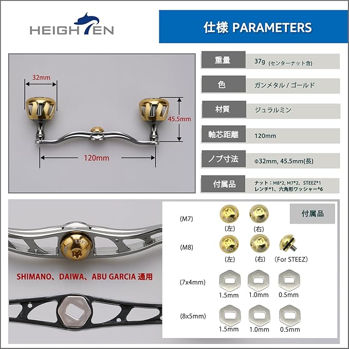 【付属】4x7mmセンターナット2個、5x8mmセンターナット2個、DAIWA STEEZセンターナット1個、6角ワッシャー 6個(取付部4x7mm、5x8mm)、梅レンチ1個。