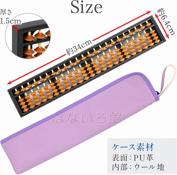 そろばんサイズ:横34cm 縦6.4cm 厚さ1.5cm ケース素材:表面 PU革 内部 ウール地