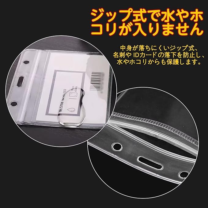 【チャック式ネームホルダー】チャック式ネームホルダーで水やホコリが入りません。名刺やIDカードの落下を防止し水やホコリからも保護します。