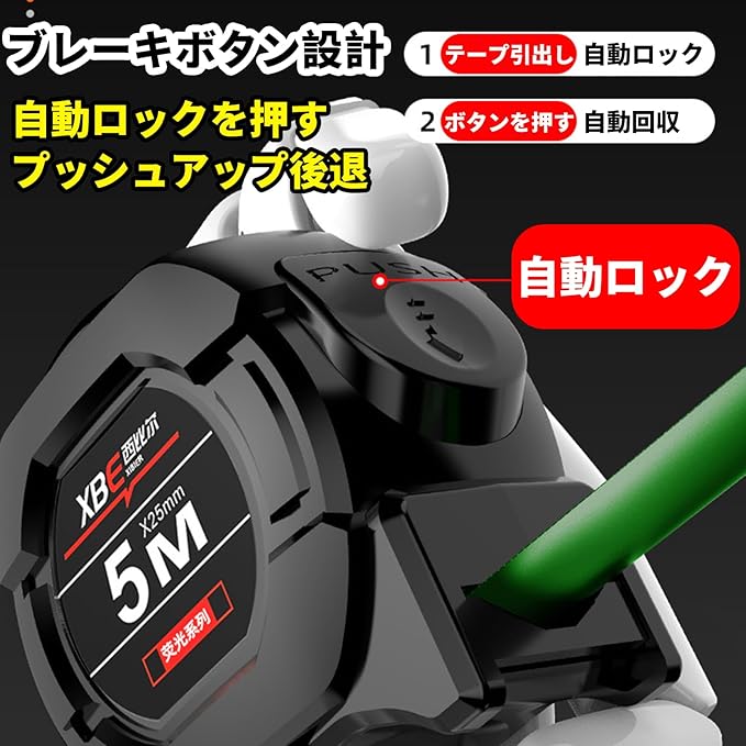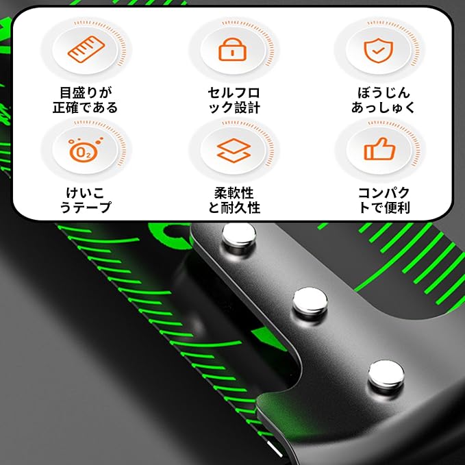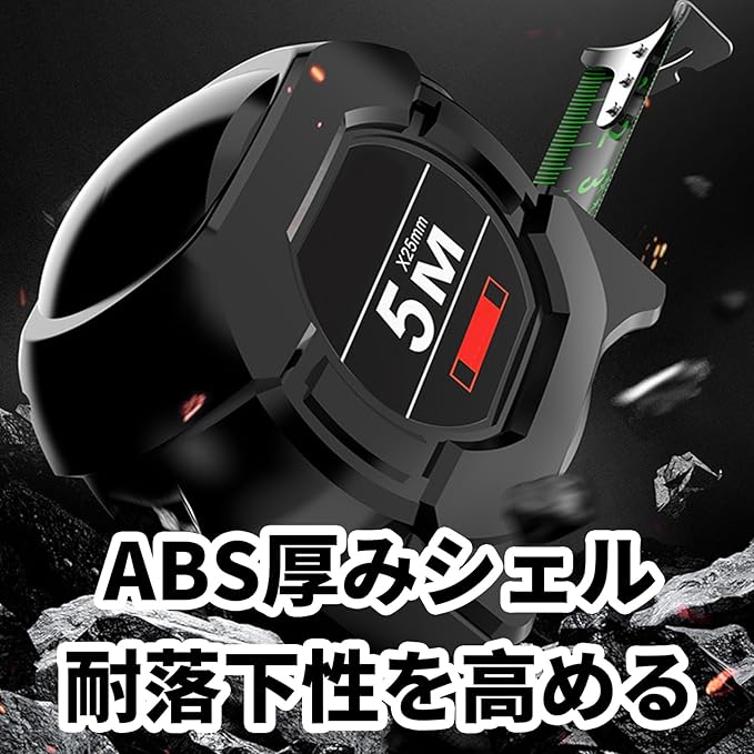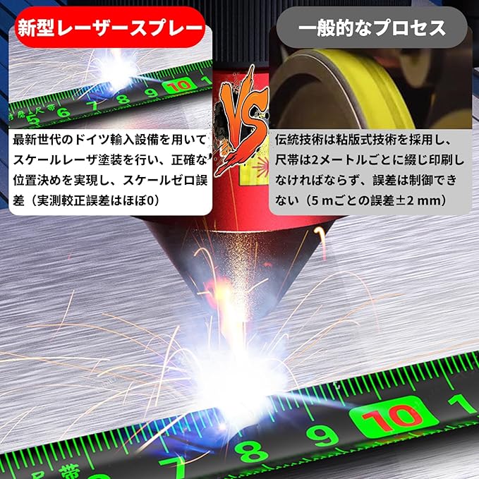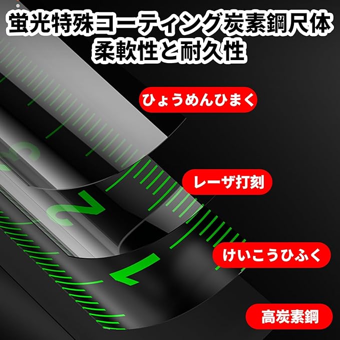 【蛍光デザイン】当社の巻尺は最新の蛍光デザインを採用し、目盛りがはっきりしています。夜間でも視認できます。 暗い場所、曇りや雨の日、夜間でも普通に使用できます。正確な測定