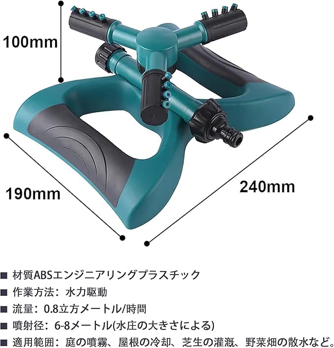 【内容】スプリンクラーサイズ(約)240mm * 190mm * 100mm。スプリンクラーは360度全方向に回転し、スプレーの高さは約2.5m、直径は約4~5mです。製品のサイズ(L W H)は24 19 16cmです。パッケージはスプリンクラー1つを含みます。