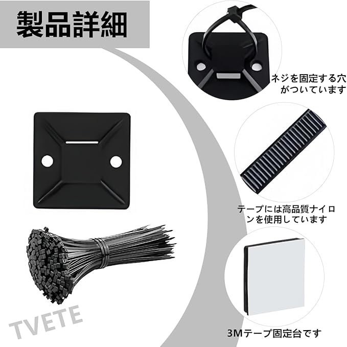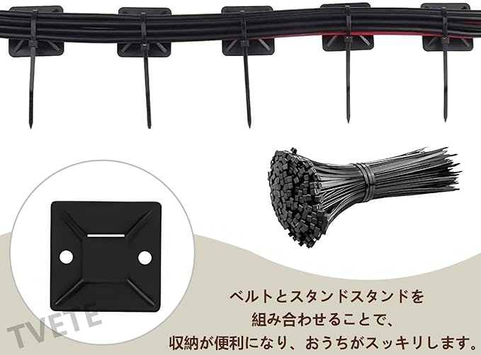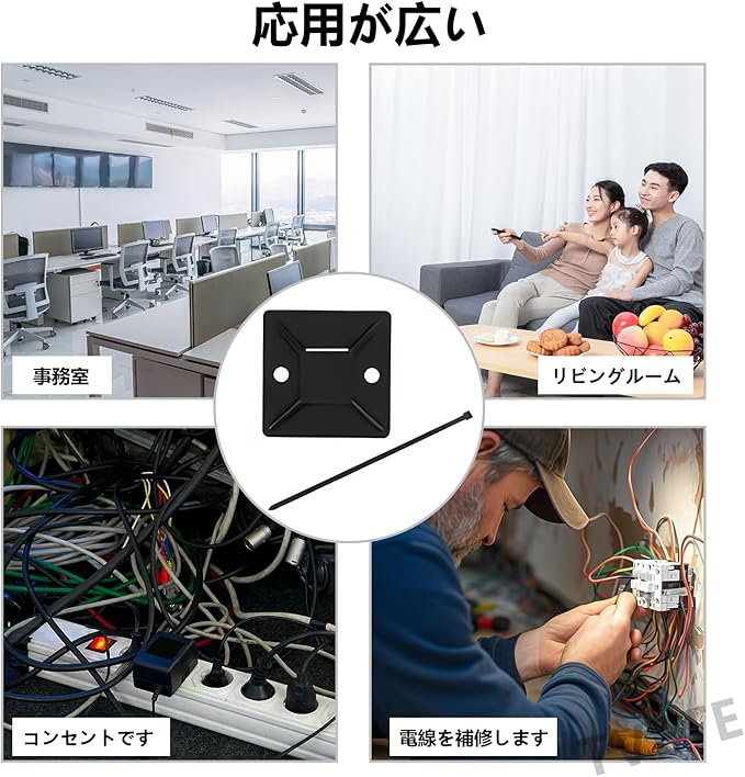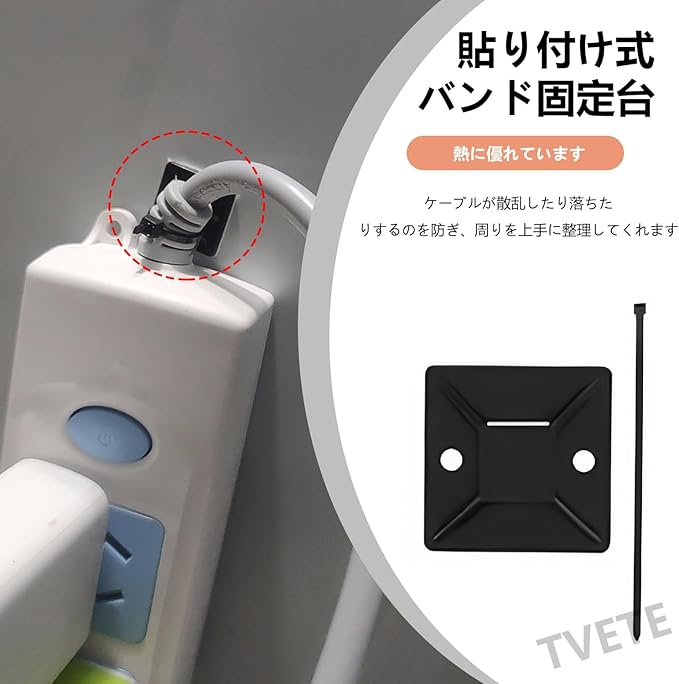 【使用方法】マウントベースの裏面のシールをはがして、貼りたい場所に貼り付けるだけで、釘を使う必要はありません。 パッケージにはジップタイが同梱されており、ジップタイをマウントベースに通すだけでケーブルを束ねることができます。