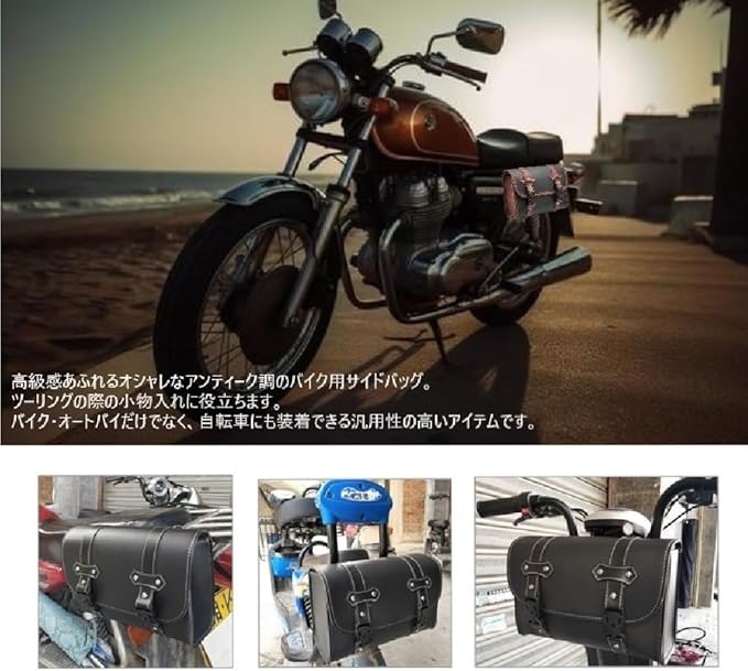 ✅【オシャレなアンティーク調のサイドバッグ】 高級感あふれるオシャレなバイク用サイドバッグです。 ツーリングの際の小物入れに役立ちます。 バイク・オートバイだけでなく、自転車にも装着できる汎用性の高いアイテムです。