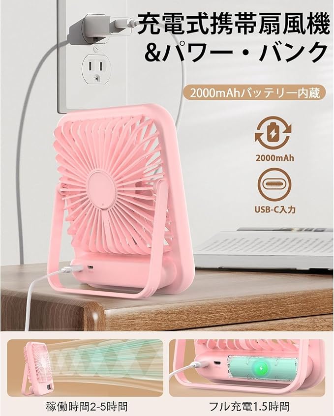 【2000mAh大容量.内蔵&長時間連続使用可能】卓上扇風機はUSB充電式で、パソコン、車載充電器、モバイルバッテリとアダプターなど、いつでもどこでもすばやく充電できます。2000mAhの大容量.が内蔵され、長時間連続動作ができます。