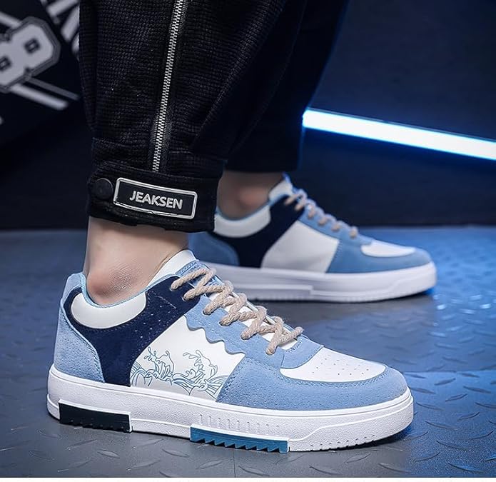 デザイン性: 波柄とグラフィックアートが特徴的な、スタイリッシュなカジュアルスニーカー。白とネイビーのコントラストが印象的