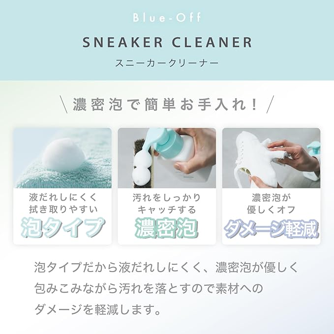 液だれしにくく、拭き取りやすい泡タイプ。濃密泡でシューズへの負担も抑えます