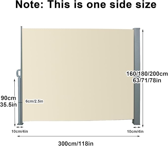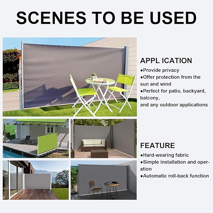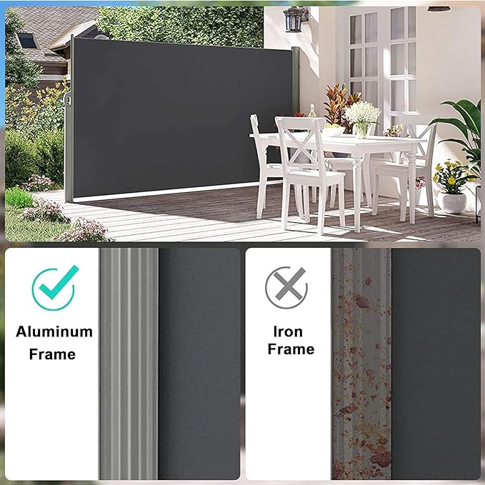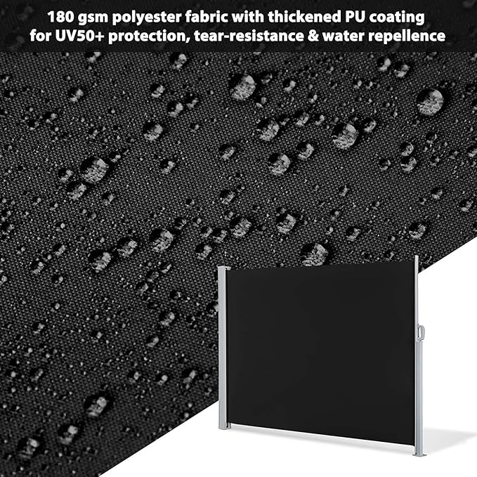 プレミアムスクリーン素材 - パティオ用の格納式サイドオーニングは、防錆サポートロッドとベースプレートを備えた防錆酸化金属フレームで作られています。 280g/m の頑丈なポリエステル生地とPUコーティング、抗UV 50+、通気性、防水性、耐引裂性、お手入れが簡単で、安定して長持ちする屋外での使用に最適です。