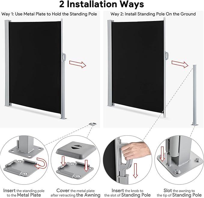 設置が簡単 - ハウジングを壁に固定し、支柱をベースプレートに取り付けるか、コンクリート、セメントの床、ウッドデッキに直接取り付けるだけで、最大限の安定性が得られます。 当社のウォールマウント格納式サイドオーニングプライバシースクリーンには、必要な取り付けアクセサリがすべて付属しているため、取り付けが素早く簡単に行えます。