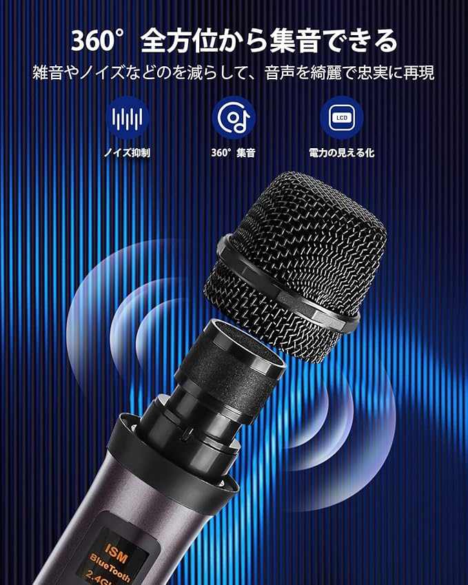 【より高音質な音楽再生】独立な低音域用のウーハーと⾼解像オーディオドライバーを採用したことに、パワフルで迫力のサウンドを実現し、臨場感のあるリアルなサウンドを体感できるカラオケセット。バックグラウンドサウンドを抑制技術に加えて、雑音やノイズなどのを減らして、音声を綺麗で忠実に再現できます。ワイヤレスマイク2本を付き、自宅でもカラオケボックスにいる雰囲気を演出できます。