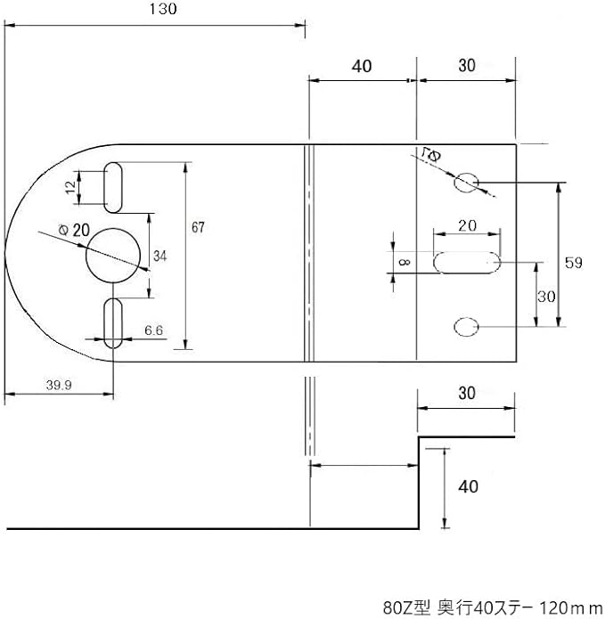 サイズ:幅80mm、長さ160mm、折り曲げ部分:奥行 40mm 取付け部穴:3ヶ所 マーカーボルト幅:67mmまで対応
