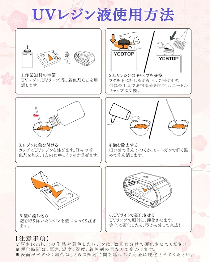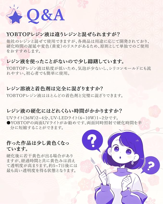 【高品質原料 & 低刺激性】YOBTOPは長年の樹脂生産の経験を持っており、レジンは環境に優しい原料を使用しております、無毒でVOCを含まず、低刺激性で作業中の不快感を大幅軽減。匂いに敏感な方でも安心してご利用いただけます。
