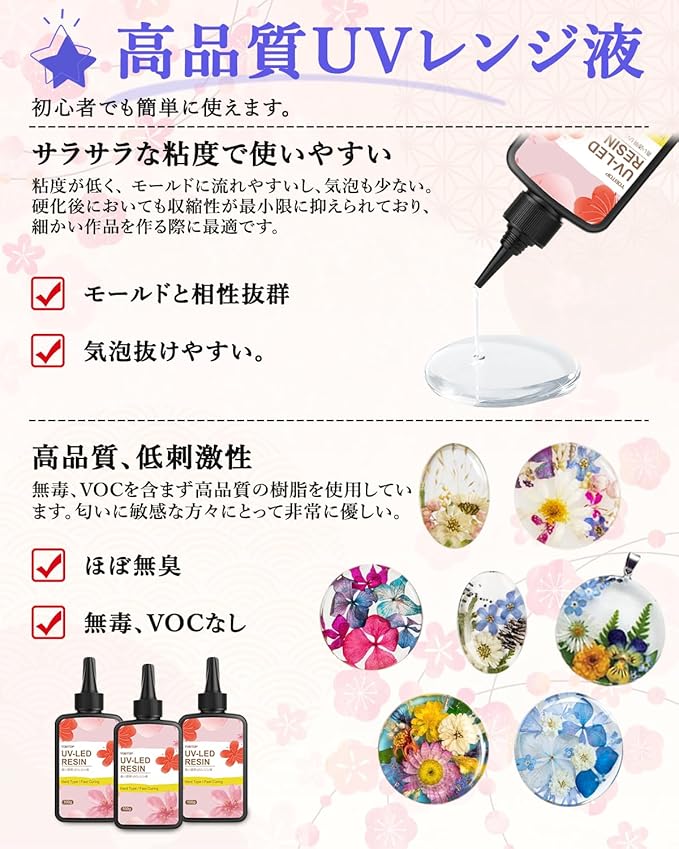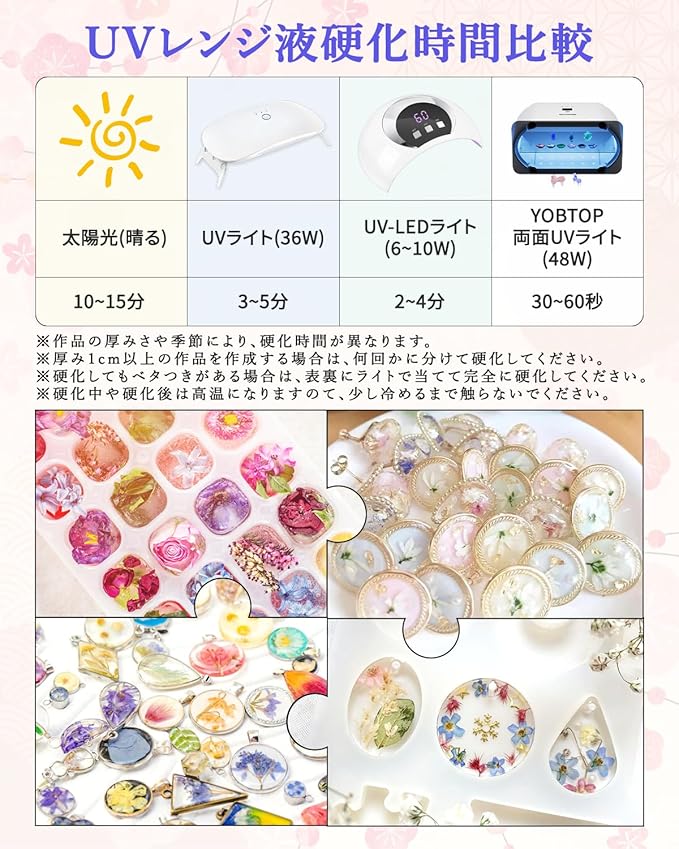 【UV-LEDランプ対応 & 超速硬化】UVレジン液はUVランプやUV-LEDランプで硬化できます。特殊配合により、硬化に要する時間が非常に短い。硬化後のべたつきが少ないので、すぐに次の工程に移れるのが特徴です。初心者からプロまで、効率的な作業が可能です。