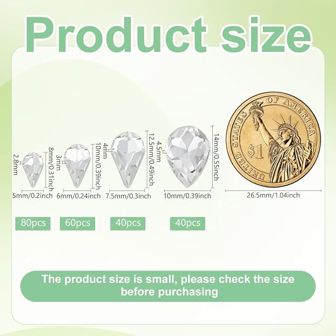 パッケージ内容: 4つの異なるサイズのミニティアドロップガラスラインストーン220個をお届けします。 十分な量と豊富なサイズ合理的な組み合わせで、日常生活のさまざまなニーズを満たします。