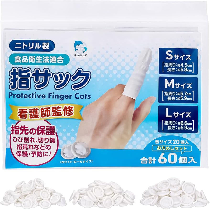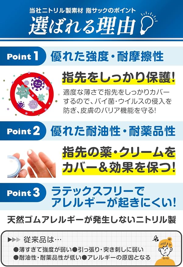 【指先をしっかり保護】ニトリル製素材は、引っ張り・突き刺し・耐摩擦性・耐油性・耐薬品性に優れているため、指先をしっかりピンポイントで保護することができます。また、トラブルがある指先に塗った薬・クリームを上からしっかりカバーし、効果を持続させることができます。