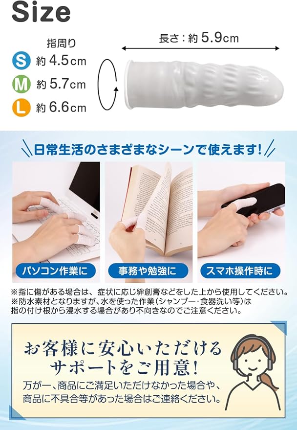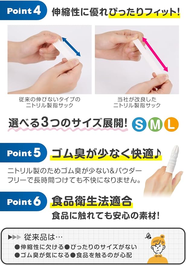 【指先にぴったりフィット】既存のニトリル製指サックの伸縮性を改良し、よりフィットする仕様にしました。またS,M,L3つのサイズ展開で自分の指にぴったり合ったものが選べます。指にフィットするので指先の感覚を失うことなく、さまざまな作業をするのに適しています。