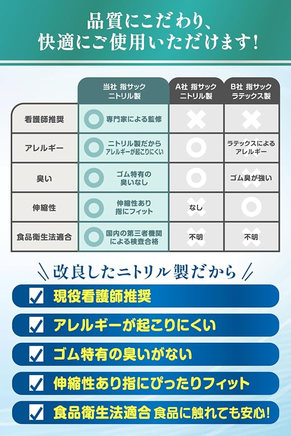 【国内検査機関合格】当社指サックの幅広い用途と使い勝手の良さから、に直接触れる可能性を考慮し、国内の検査機関により、[衛生法適合]とされた指サックをお手元にお届け致します。