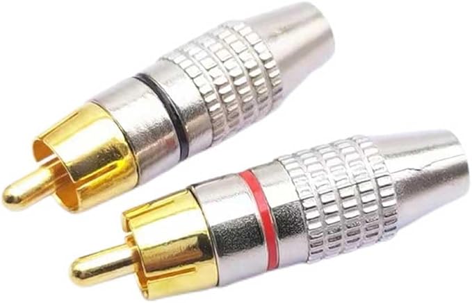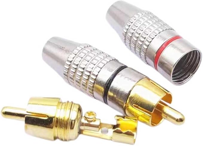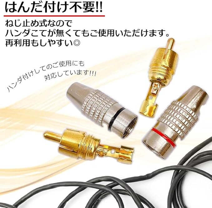 コネクター:RCA端子(RCAプラグ)オス芯線(センタープラグ)ブラック+レッドの8個セットです。 適応最大外径:Φ6mm 商品サイズ:Φ10mm 42mm 重量:7g/1個 カラー:ゴールド インピーダンス:50Ω 電圧:AC500Vrms 周波数:DC~4GHz
