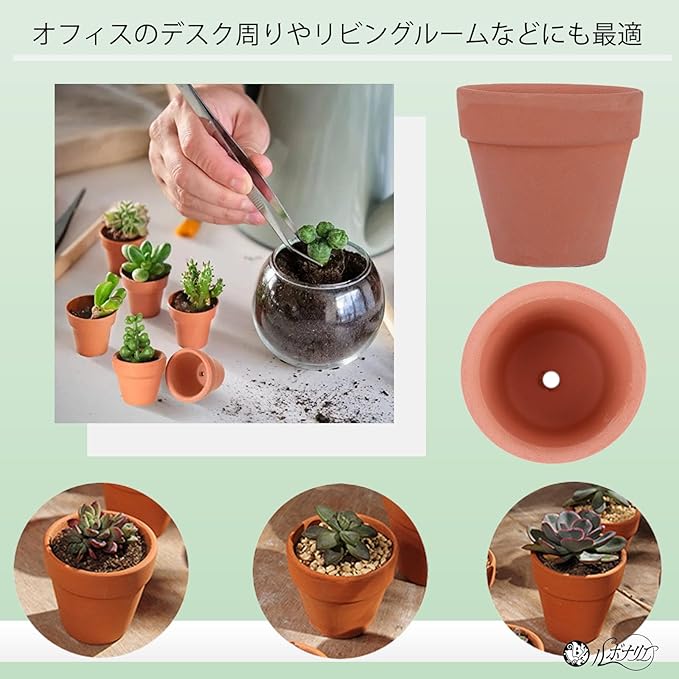小さなサイズで、卓上や窓辺などのスペースに最適な素焼きポットです。10個セットをご用意しましたので、オフィスのデスク周りやリビングルームなど様々な場所の緑化を手軽に行うことができます。