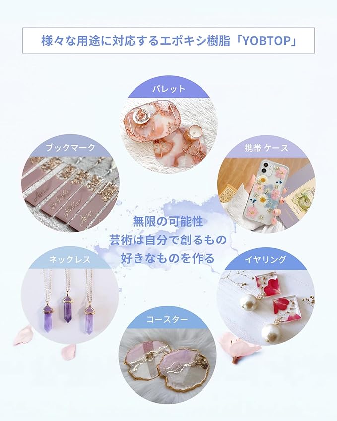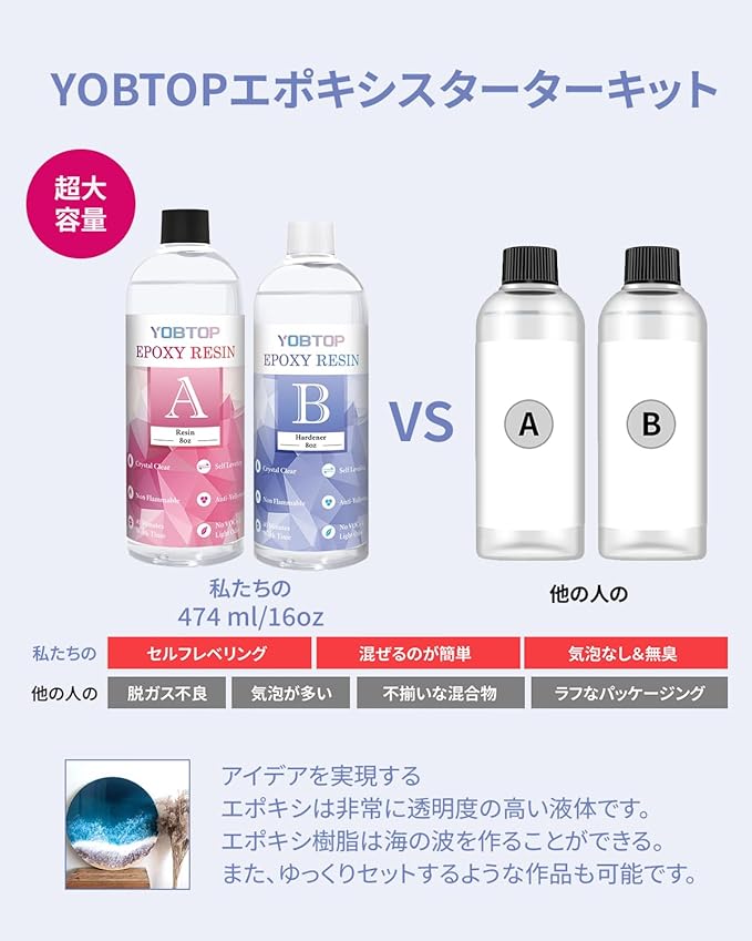 【高品質の製品】YOBTOPは20年間エポキシ樹脂の生産経験があり、高品質の原料サプライヤーを厳選しています。 VOC(有機溶剤)フリー、気泡フリー、ほぼ無臭のレジン液を製造しており、完成品は時間が経っても光沢と輝きを保ちます。 ご不明な点がございましたら、お気軽にお問い合わせください。