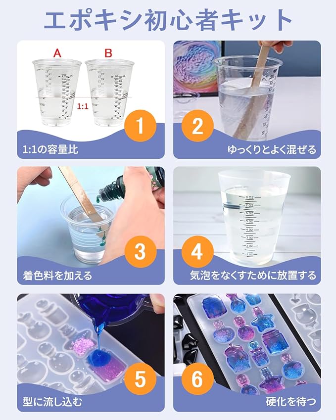 【使い方は簡単】計量カップに体積比1:1のレジンと硬化剤を同量入れ、ゆっくりと同じ方向によく混ぜ、そのまま放置して泡が立ち、はじけるのを待ちます。泡を消すスピードを早めたい場合は、計量カップをお湯の中に入れても構いません。 この後、適量の着色料やグリッターを加え、最後に型に流し込んで完成を待つ!