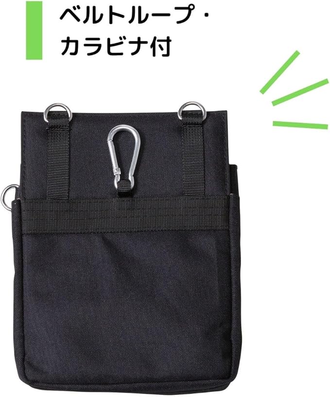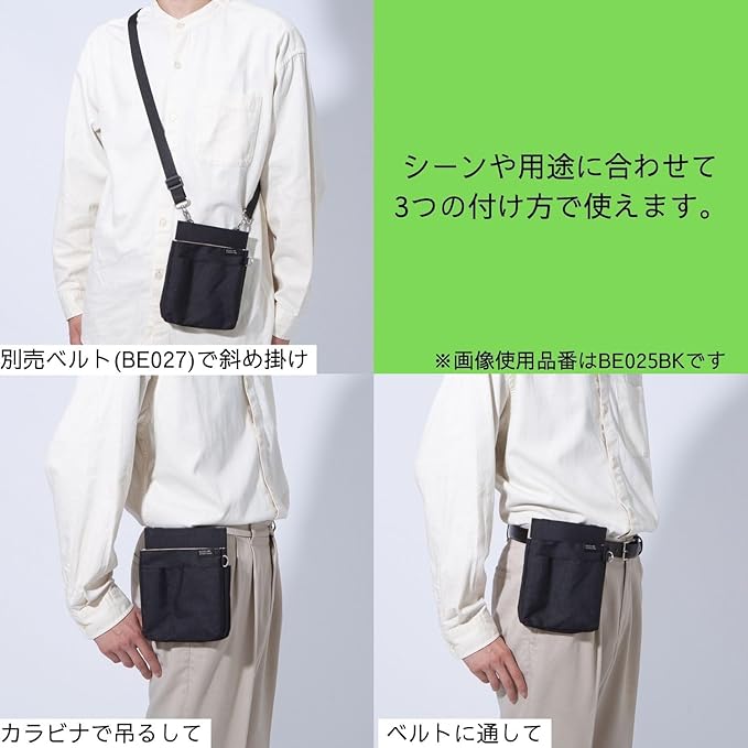 【特徴5】ベルトに通す・カラビナで付ける・斜め掛け(別売りベルトBE027をつけて)の3WAYで使用可能