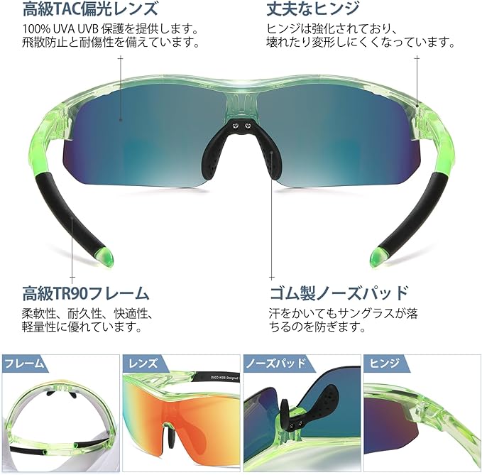 高品質のTACレンズを採用しており、耐衝撃性があり、傷がつきにくくクリアな視界を提供します。野球のプレー中にも安全に使用できます。
