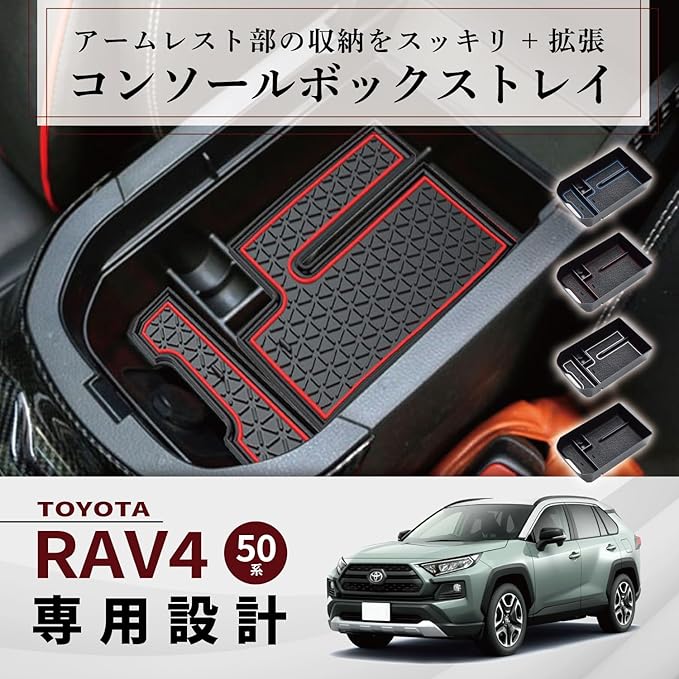 【商品概要】:トヨタ RAV4 50系専用設計の収納拡張トレイです。スマホや鍵、財布などの小物を収納することができます。センターコンソールボックスに差し込むだけで取り付けられ、簡単にアームレスト部の収納が拡張、さらには底の深い収納が浅型を兼ねることで視認もしやすく、取り出しやすいです。また、自己吸着性ラバーマットにより小物がぶつかる音や傷も最小限に抑えられます。