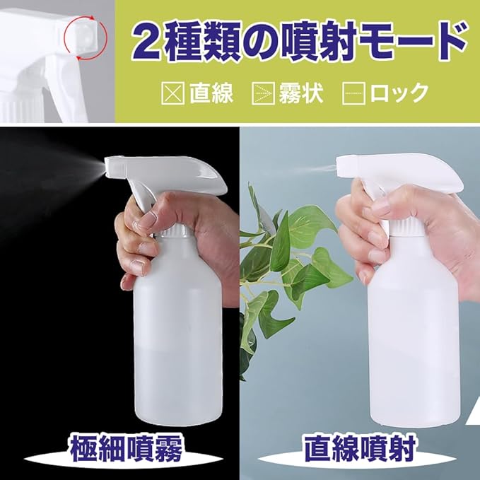 【2種類の噴射モードとロック機能】ノズルには3つの機能があり、「極細噴霧」「直線噴射」という2種類の噴射モードのほか、ロック表示もあります。使用しない場合はノズルをロックすれば漏れることがなくお使いいただけます。