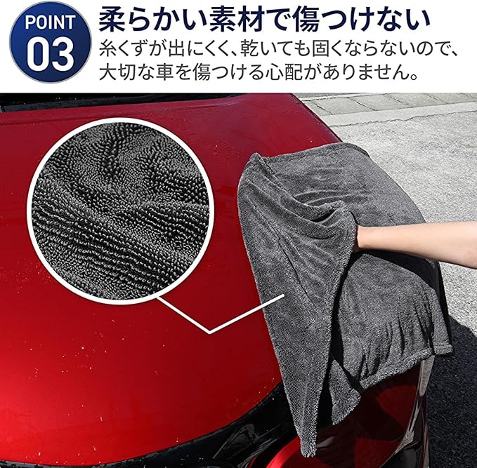【糸くずや拭き跡も残らない】タオル素材が柔らかくて車の表面に傷をつけにくいです。また、塗装やコーティングなどの表面を傷つけることもありません。ツイスト織り製法を使用しており、使用後車体やガラスの表面にほとんど糸くずが残らず、洗濯機の詰まりの心配も要りません。