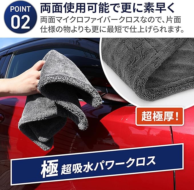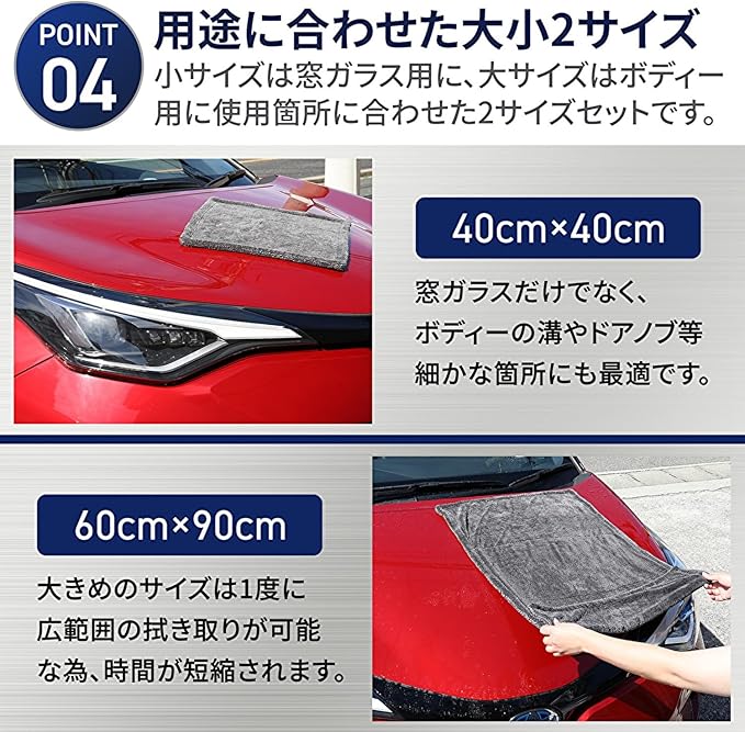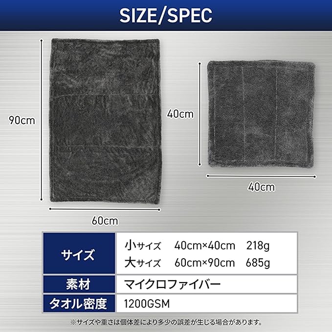 【仕様】サイズ60x90cm/40x40cm 各1枚ずつ、計2枚のセットです。ロングツイストマイクロファイバーを使用しており、細かい繊維が水分をスムーズに吸収します。ボディーやガラスにタオルを乗せて引っ張るだけでだけで、驚くほどに表面の水分を一瞬に拭き取り、素早く乾かすことができます。また両面マイクロファイバータオルなのでひっくり返して拭くことが可能です。