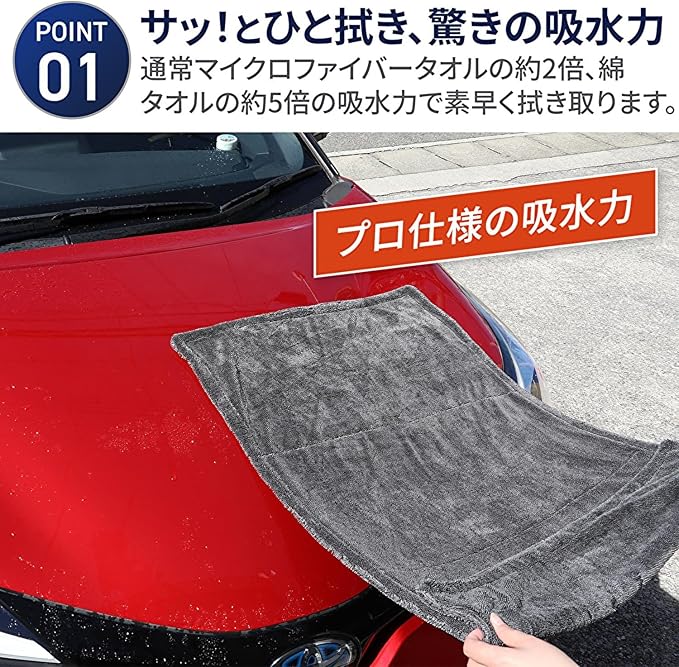 【多機能用途】車外だけでなく車内でも幅広く使用できます。通常のタオルより5倍、一般的マイクロファイバー(片面)より2倍の吸水性が優れており、洗車時間を半分まで短縮できます。 また、ペットの濡れた体を拭くのにもご使用いただけます。