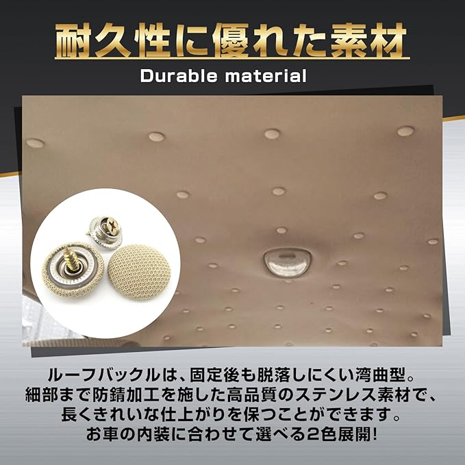 ルーフバックルは、固定後も脱落しにくい湾曲型。ネジも含め、細部まで防錆加工を施した高品質のステンレス素材で、長くきれいな仕上がりを保つことができます。お車の内装に合わせて選べる2色展開!
