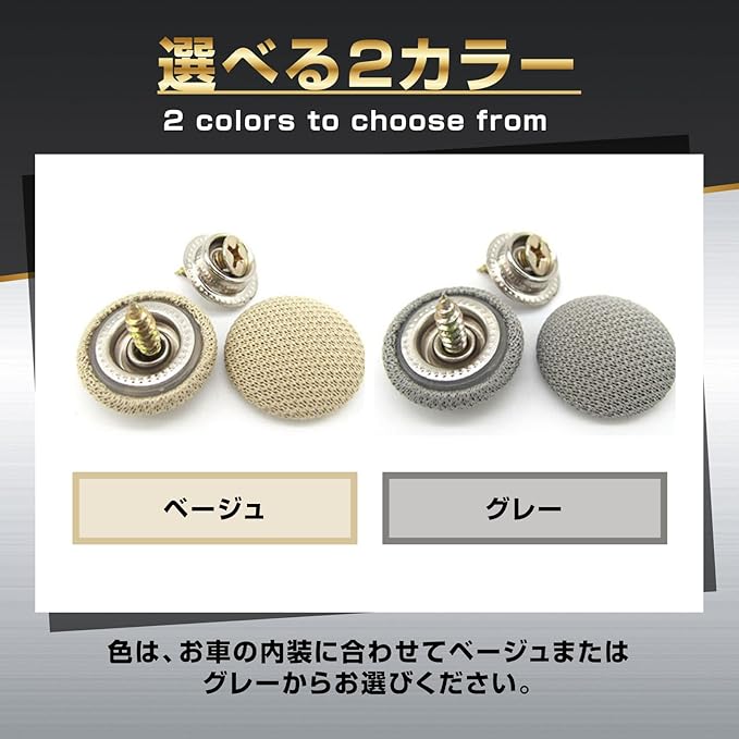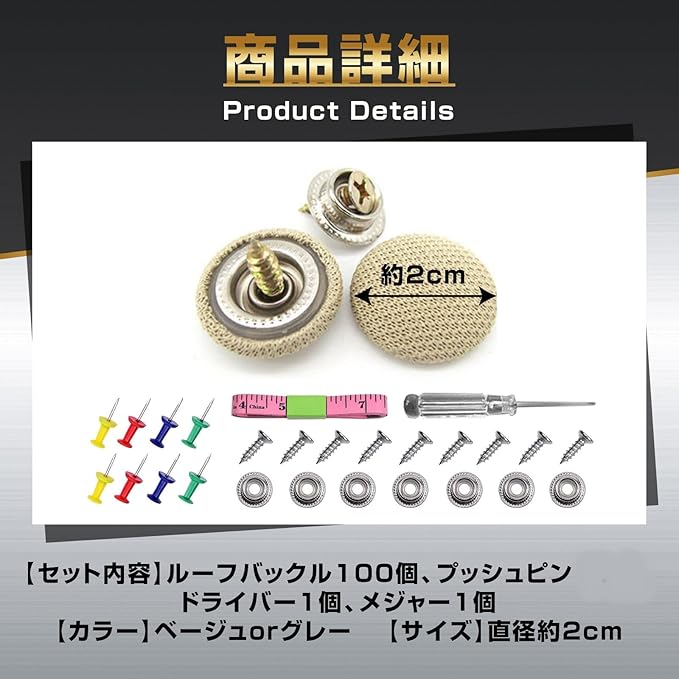 ※取扱説明書は付属しておりません。【セット内容】ルーフバックル100個、プッシュピン、ドライバー1個、メジャー1個【カラー】ベージュorグレー 【サイズ】直径約2cm※モニターの環境により、色の見え方に若干差が生じる場合がございます。