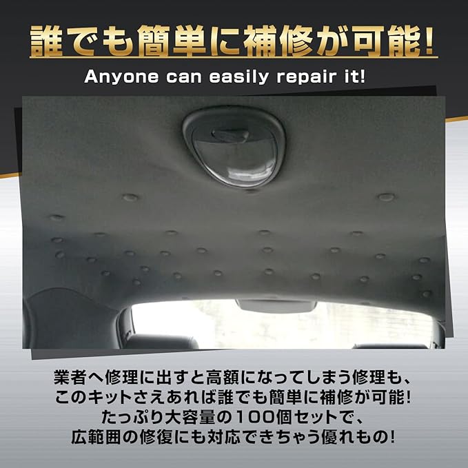 たるんだり、剥がれ落ちてきたりした車内天井のルーフクロス……業者へ修理に出すと高額になってしまう修理も、このキットさえあれば誰でも簡単に補修が可能!たっぷり大容量の100個セットで、広範囲の修復にも対応できちゃう優れもの!