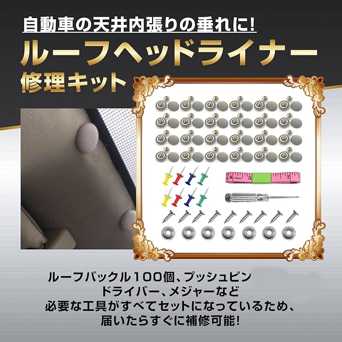 自動車の天井内張りの垂れに!ルーフヘッドライナー修理キットです。ルーフバックル100個、プッシュピン、ドライバー、メジャーなど、必要な工具がすべてセットになっているため、届いたらすぐに補修可能!色は、お車の内装に合わせてベージュまたはグレーからお選びください。