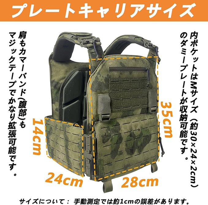 【タクティカルベストのサイズ】M~4XLまで対応(マジックテープで調整可)・肩寸:20~37㎝まで調整可・高さ:45~60㎝・横幅:85~125㎝・重量:約1.5㎏。プレキャリの全てのプレートが着脱可。このタクティカルベストは、EVAメッシュパッドが付属しています。本製品には3連マガジンは含まれておりませんが、当店では3連マグポーチを販売しております。