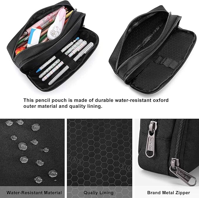 高品質の素材とアクセサリー:ブラックのペンシルケースは、耐久性のある軽量のオックス素材でできており、耐水性、耐引裂性、洗浄性があります。ただし、ジッパーは防水ではありませんので、水に入れることはできません。ジッパープラーと滑らかなジッパーは、より長い耐用年数を提供します。