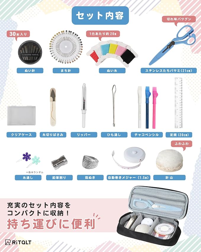 付属コンポーネント 縫い針、縫い糸、まち針、ピンクッション、裁ちばさみ、糸切りばさみ、指ぬき、リッパー、ひも通し、糸通し、チャコペンシル、鉛筆削り、定規、メジャー