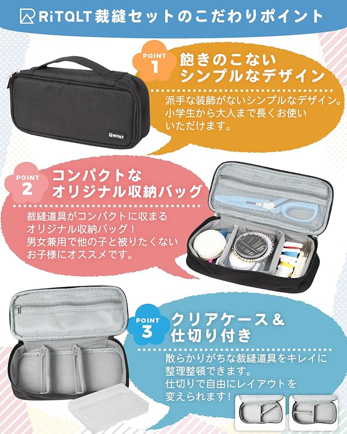 【こんなお悩みに!】❶小学校で使う裁縫セット、みんなとかぶりたくない・・・ ❷どうせ買うなら長く使いたい・・・ ❸細かいアイテムが多く、散らかりやすい・・・