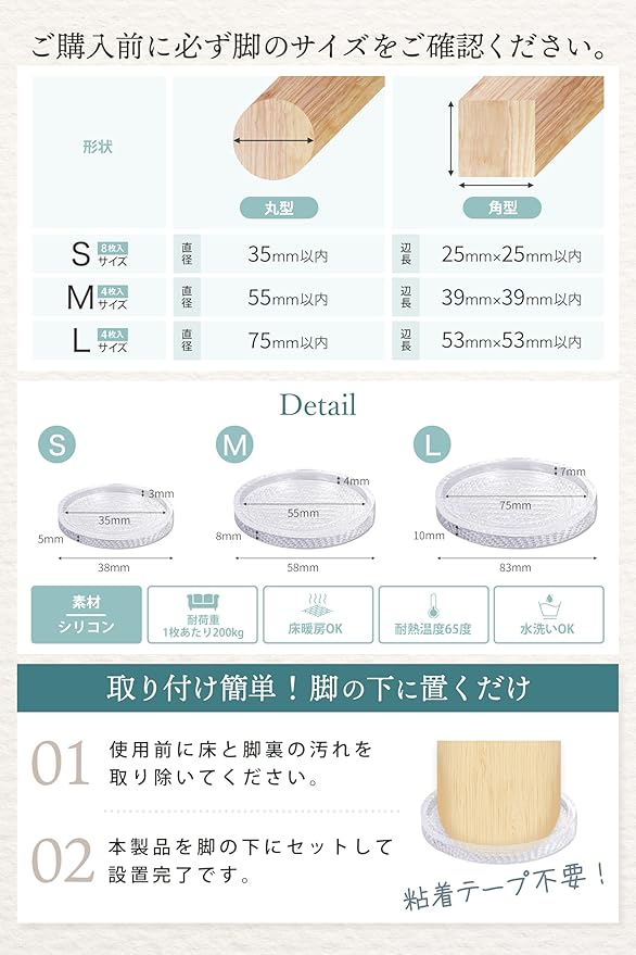 ✅【置くだけ簡単!脚の下に置くだけ♪】使用前に床と脚裏の汚れを取り除いていただき、本製品を脚の下にセットして設置完了です。粘着テープ不要でも、しっかり固定できます。床やソファーにべたつきなどの心配なし。