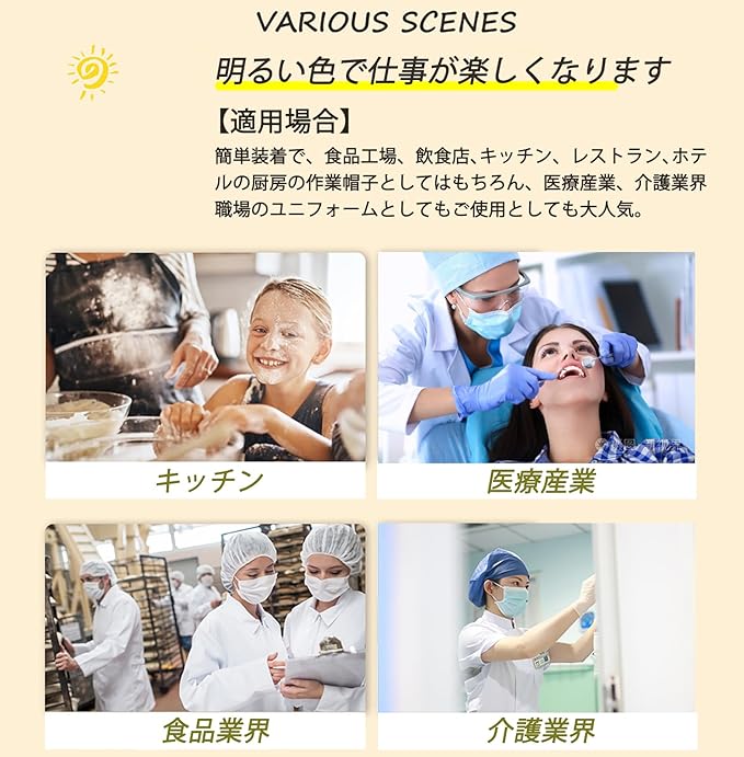 【適用場合】簡単装着で、工場、飲食店、キッチン、レストラン、ホテルの厨房の作業帽子としてはもちろん、給食などの配膳時の給食帽、職場のユニフォームとしてもご使用としても大人気。着脱もしやすく、飲食店、惣菜やさん、スイーツ、和菓子店など幅広く使えます。