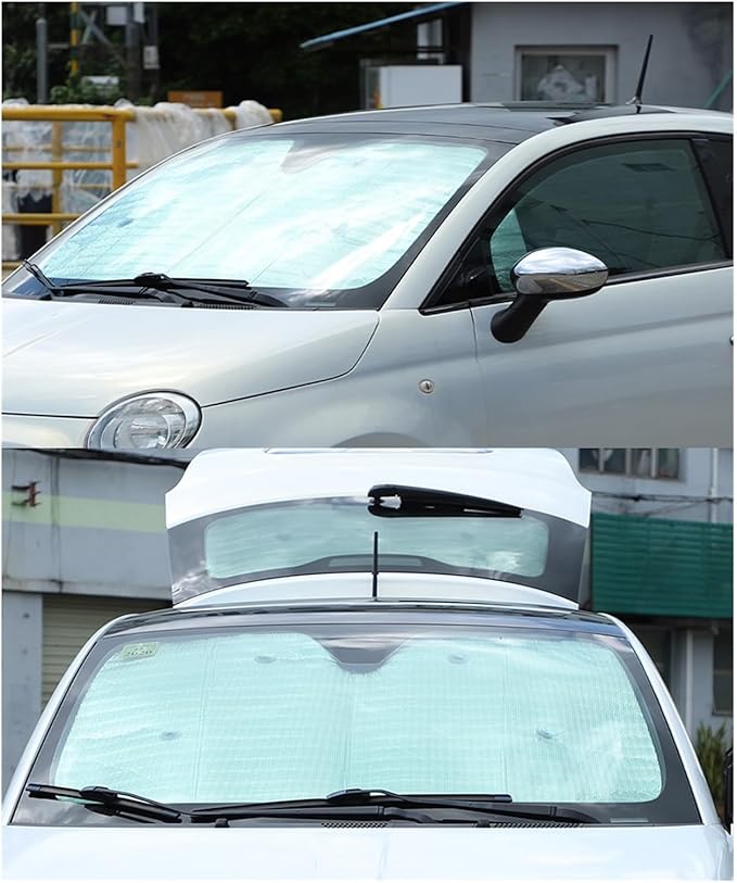 フロントシェードはアルミホイル製で、紫外線防止機能と太陽光の反射機能があり、車内の温度を下げます。