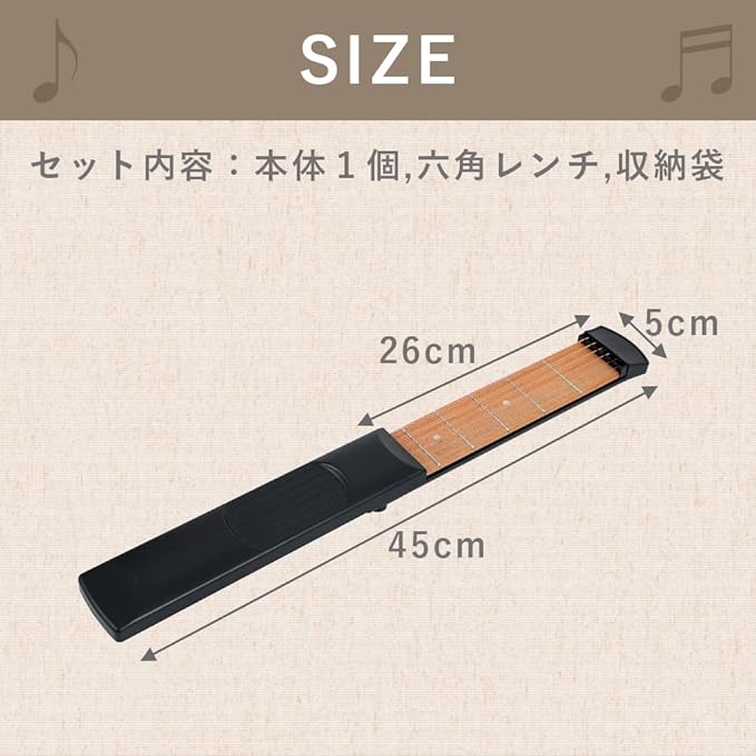 【商品詳細】商品内容:6弦ポケットギター,収納袋,六角レンチ、サイズ:縦26cm,横5cm高さ3.3cm、最大展開サイズ:45cm、重さ:160g
