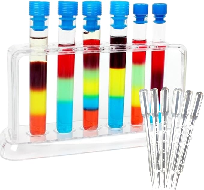 ✅プラスチック製のフタ付き試験管6本・試験管立て・スポイト6本のセットです。試験管は割れる心配のないプラスチックですので、小さいお子様でも扱いやすく、蓋つきのため中身の液体をこぼすこともありません。