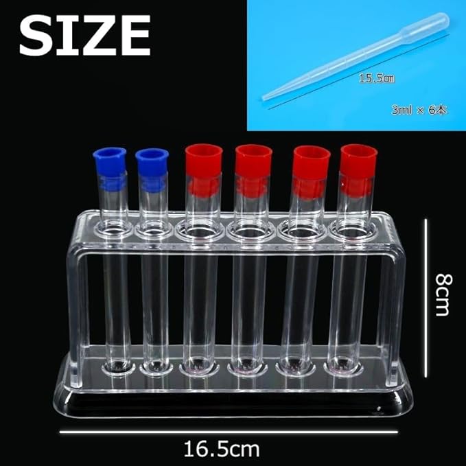 ✅サイズ: 試験管立て(赤) 16*5*5cm (クリア)16.5*8cm / 試験管 長さ10cm(直径15~16㎜ 4本,直径12~13㎜ 2本)/ スポイト 長さ15.5cm(3ml 6本)